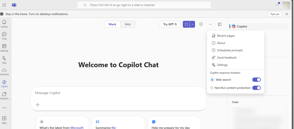 When an organisation applies a policy to adjust AI protections, users will see a Harmful Content Protection toggle in the More menu of Copilot Chat.